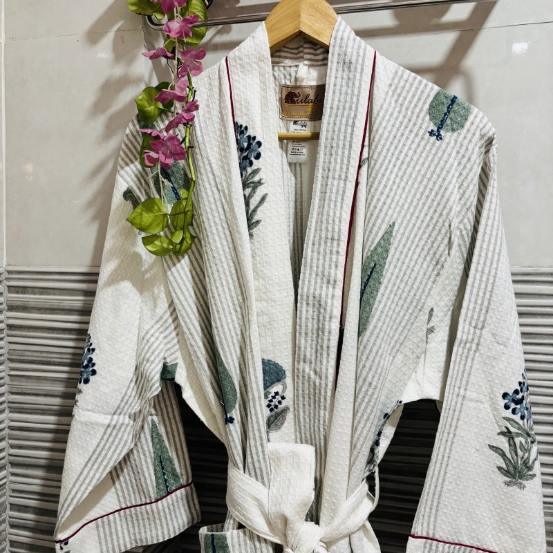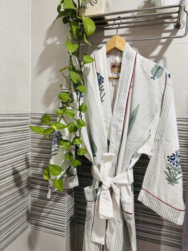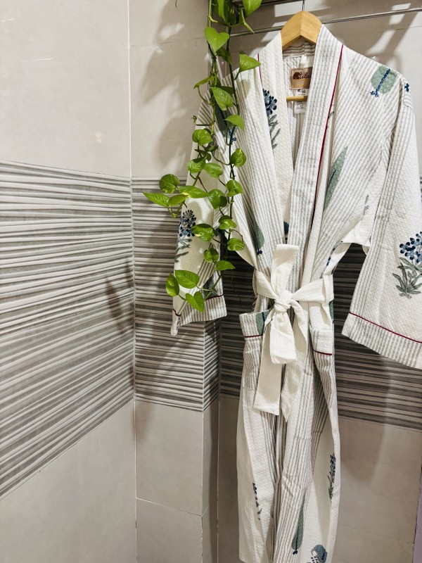 Adorned with delicate handblock prints, this robe brings the timeless charm of artisanal craft into your self-care rituals. Each motif is carefully stamped by skilled artisans, ensuring that no two robes are ever exactly the same — a celebration of uniqueness and tradition.