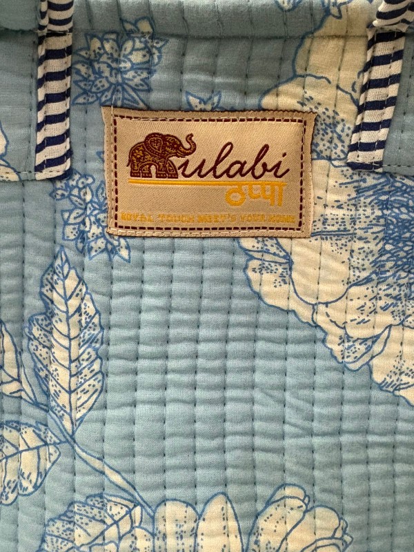 Each bag is hand block printed by skilled artisans in Jaipur, showcasing intricate floral motifs in vibrant colors that celebrate the timeless art of Indian craftsmanship. The open-top design allows for easy access to your lunch boxes, fruits, or snacks, making it both practical and visually appealing.