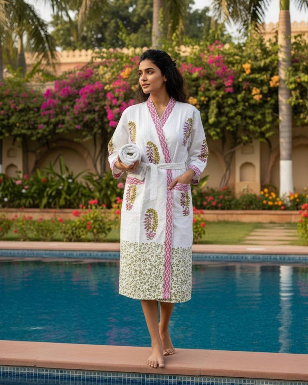 Experience unmatched comfort and elegance with Gulabi Thappa’s Waffle Cotton Hand Block Printed Unisex Bathrobe, crafted from premium Madurai high-absorption waffle cotton. Designed for everyday relaxation, this robe combines traditional Jaipuri hand block printing with modern functionality, offering a soft, breathable, and quick-drying experience after every bath or shower.