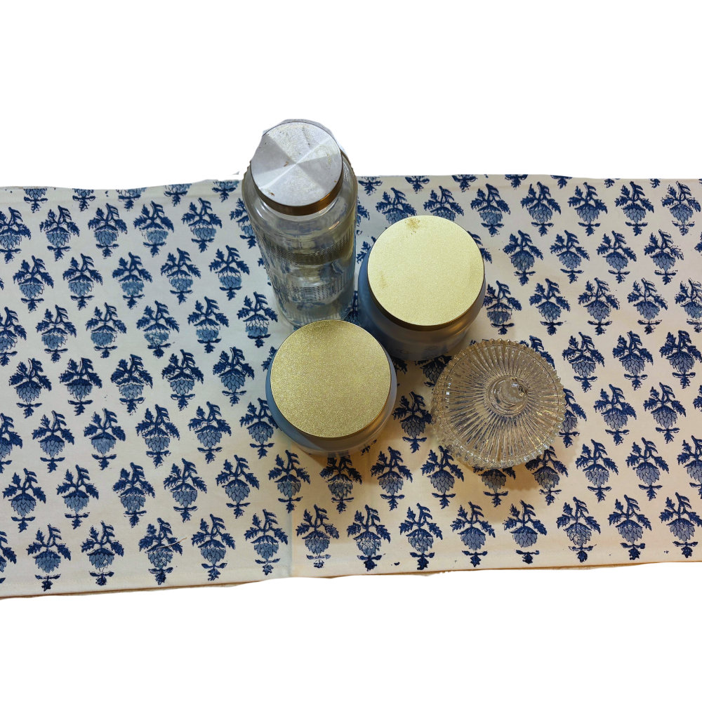 Enhance your dining table with the timeless beauty of Gulabi Thappa’s Hand Block Printed Canvas Cotton Table Runner — a perfect fusion of artistry, tradition, and modern style.