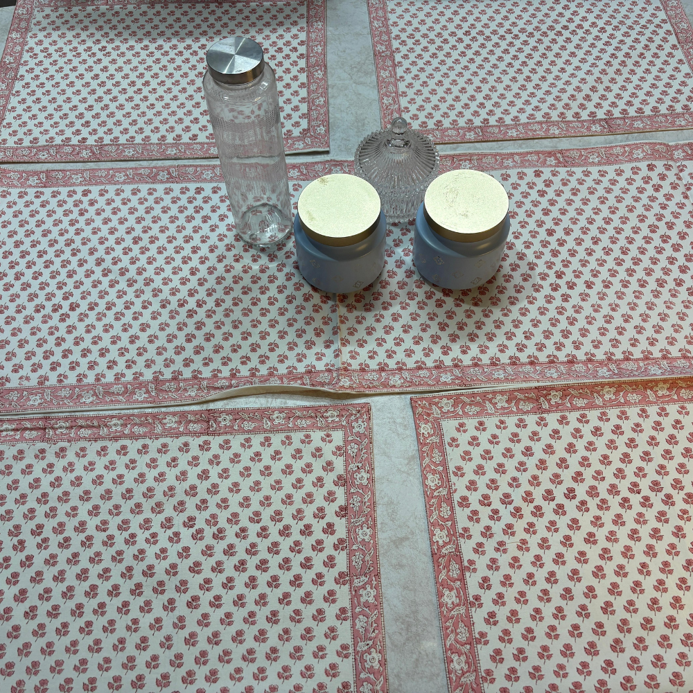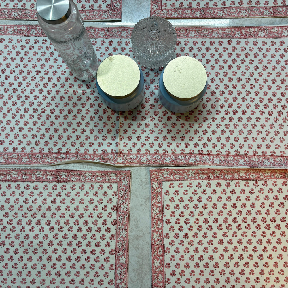 Expertly hand block printed by skilled Jaipur artisans, each piece in this set showcases intricate patterns inspired by traditional Indian design. Made from 100% premium cotton canvas, the fabric is soft yet durable, ensuring long-lasting use and a luxurious texture that enhances any dining setting.
