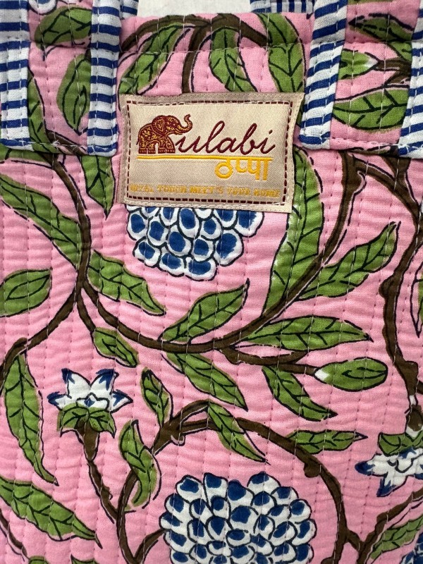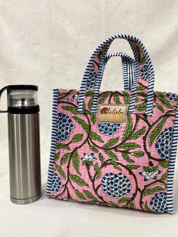 Each bag is hand block printed by skilled artisans in Jaipur, showcasing intricate floral motifs in vibrant colors that celebrate the timeless art of Indian craftsmanship. The open-top design allows for easy access to your lunch boxes, fruits, or snacks, making it both practical and visually appealing.