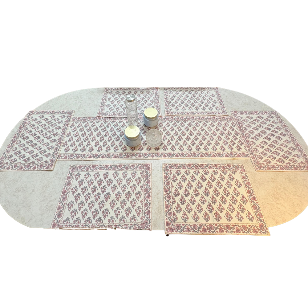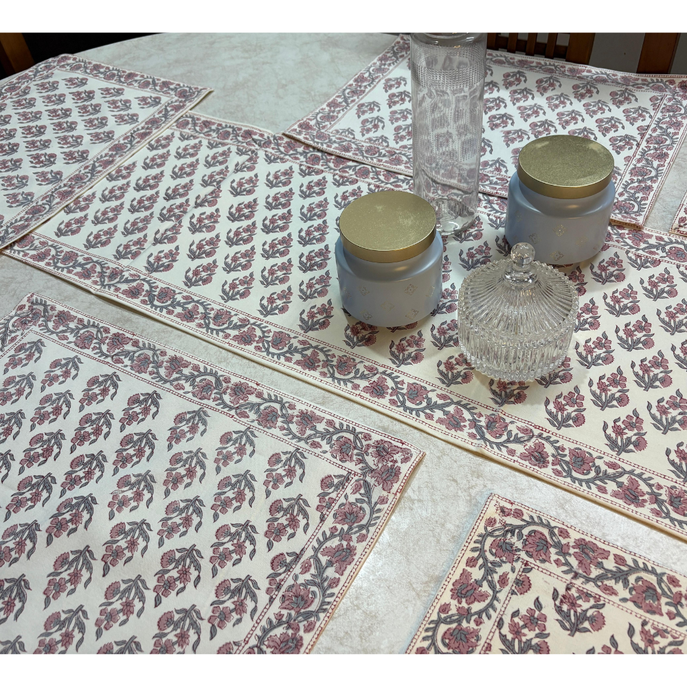 Jaipuri Hand Block Printed Dining Set – 1 Table Runner & 6 Placemats, 100% Cotton