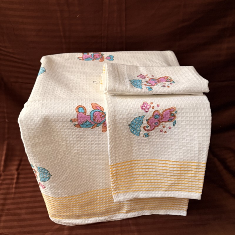 Crafted from 100% soft waffle cotton, these towels become softer with every wash, providing a cozy and absorbent experience for children. The handblock printing technique ensures that each motif reflects authentic heritage, combining color, pattern, and quality in a delightful design.