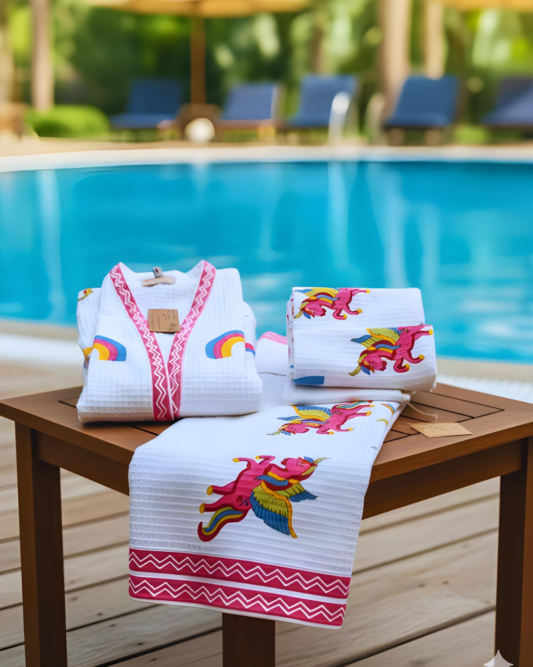 Crafted from 100% soft waffle cotton, these towels become softer with every wash, providing a cozy and absorbent experience for children. The handblock printing technique ensures that each motif reflects authentic heritage, combining color, pattern, and quality in a delightful design.