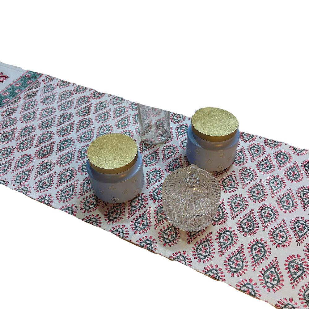 Enhance your dining table with the timeless beauty of Gulabi Thappa’s Hand Block Printed Canvas Cotton Table Runner — a perfect fusion of artistry, tradition, and modern style.